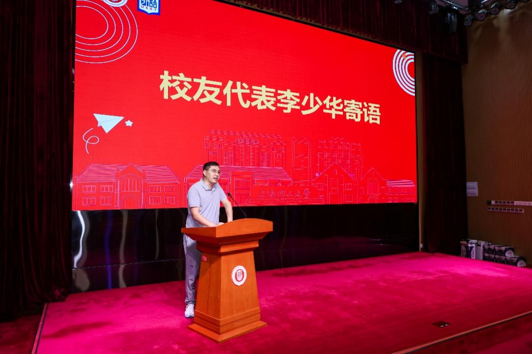 Herr Li Shaohua, ein herausragender Alumni der USST, Absolvent des Sprachstudiengangs der Fremdsprachenfakultät des Jahrgangs 2000 und heutiger Vorstandsvorsitzender der Shanghai Waterclean Environmental Protection Technology Co., Ltd., kehrte an seine Alma Mater zurück. Er teilte seinen beruflichen Werdegang von der „absoluten Anfängerin in der Branche“ zum „Mitgestalter von Branchenstandards“ mit. Seine Botschaft an die jüngeren Kommilitonen lautete: „Je mehr Verantwortung ihr schultern könnt, desto mehr Menschen werden dort sein, die eure Träume tragen.“ Er ermutigte alle, die Zeit an der Universität zu schätzen und bewusst Integrität und Professionalität aufzubauen. Zudem wurden vor Ort Video-Grußworte von Alumni aus verschiedenen Regionen des Landes gezeigt. Die warmen Worte und aufrichtigen Wünsche überwanden alle Distanzen und vereinten sich zu einer kraftvollen Quelle der Motivation für die Erstsemester.